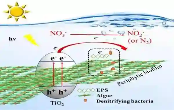 基于周丛生物对污染物胁迫较强的适应性,进一步揭示了周丛生物对多种污染物的去除机制,并发展了基于周丛生物的污染物强化去除技术。研究发现,周丛生物较强的生物吸附性、降解能力和絮凝能力,使其对重金属(Cu)、有机染料(结晶紫、苯胺蓝)等多种常见污染物就有很好的去除效果,并发展出相应的固定化周丛生物反应器和生物絮凝技术(Liu et al., Bioresour Technol, 2018; Shabbir et al., J Clean Prod, 2018; Sun et al., Bioresour Technol, 2018)。同时探讨了周丛生物生物转化与光催化等电化学过程的耦合机制和效应,研究表明通过较强的胁迫适应性和生物吸附性,周丛生物能够很好地与光催化材料、上转换材料等形成微生物-功能材料的复合体系,通过提供光生电子和群落的优化增强周丛生物对氮、磷和重金属等面源污染物的去除能力(Zhu et al., ES&T, 2018; Zhu et al., Chem Eng J, 2018; Zhu et al., Bioresour Technol, 2018)。