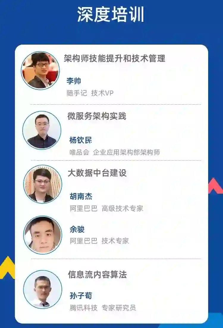 除了以上话题,会议上还增加了深度培训环节,邀请阿里、腾讯、唯品会、随手记的技术专家与大家一起分享各自在大数据中台、微服务架构、算法和技术管理方面的实践和经验。