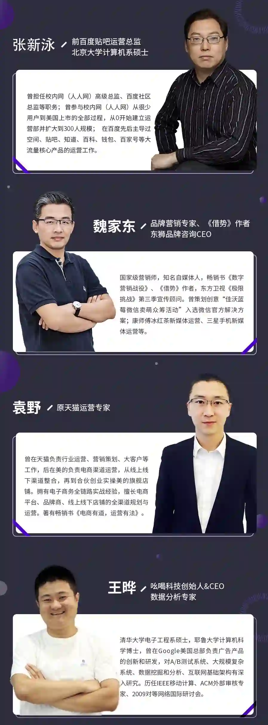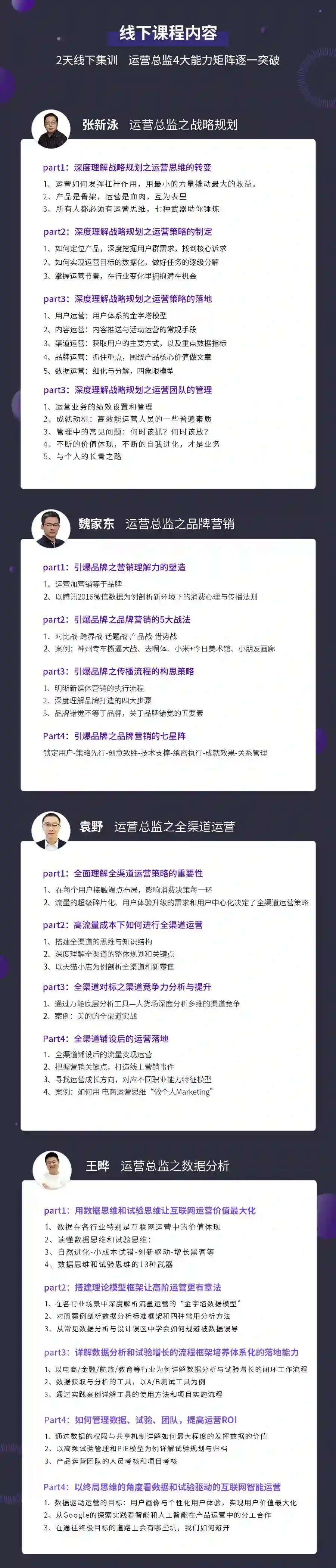 课程专为中高级运营经理量身定制,四位授课老师通过线下面对面亲授形式,讲10年互联网的运营实战经验倾囊相授,致力于为运营经理的系统性成长和职场能力进阶提供更多帮助。