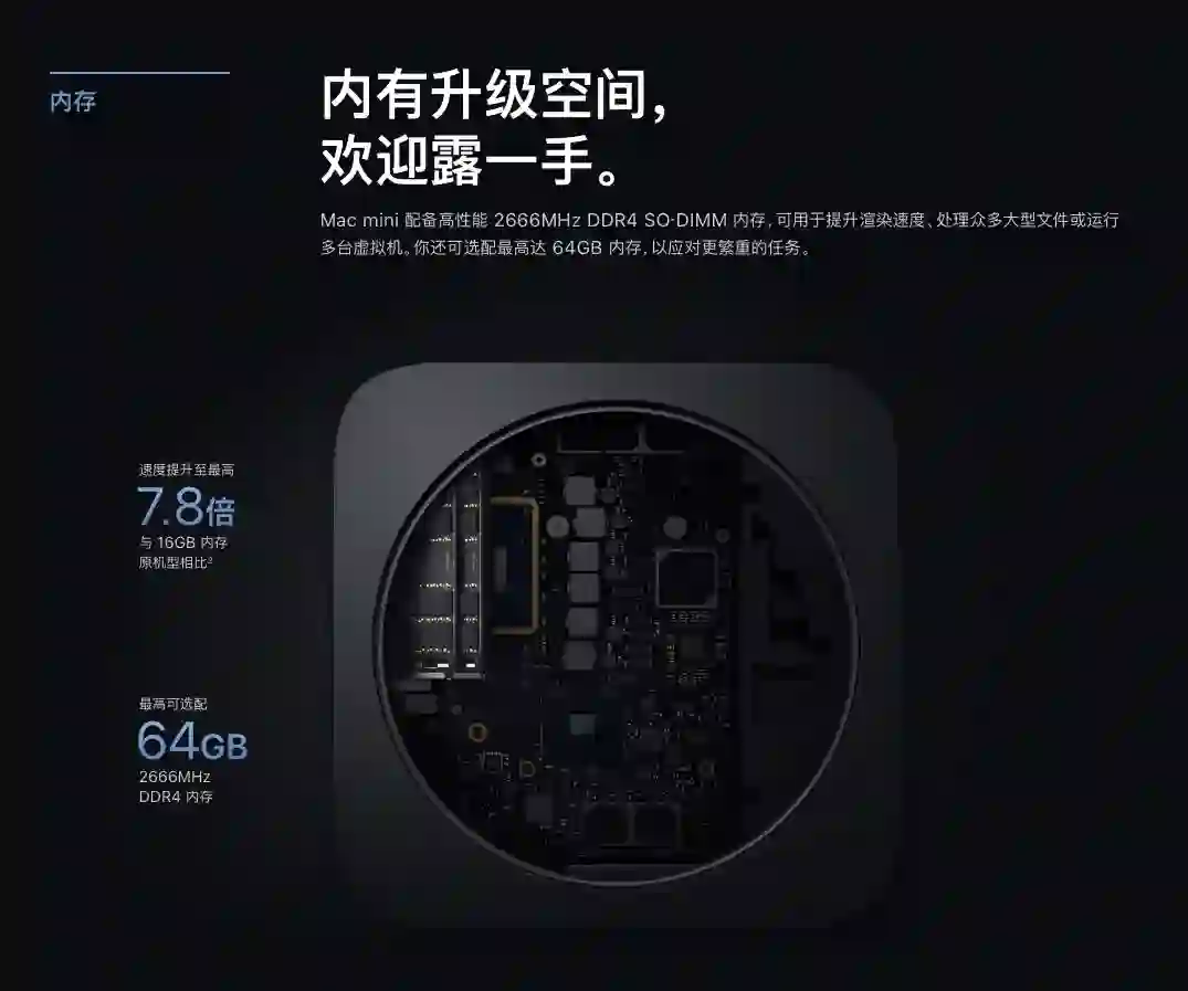 十月发布会的另一位主角是 Mac mini,苹果在发布会上说它最高可以升级到 64G 的内存,但是苹果没有告诉你其实你可以自己动手升级,并没有强制你在购买时选配。