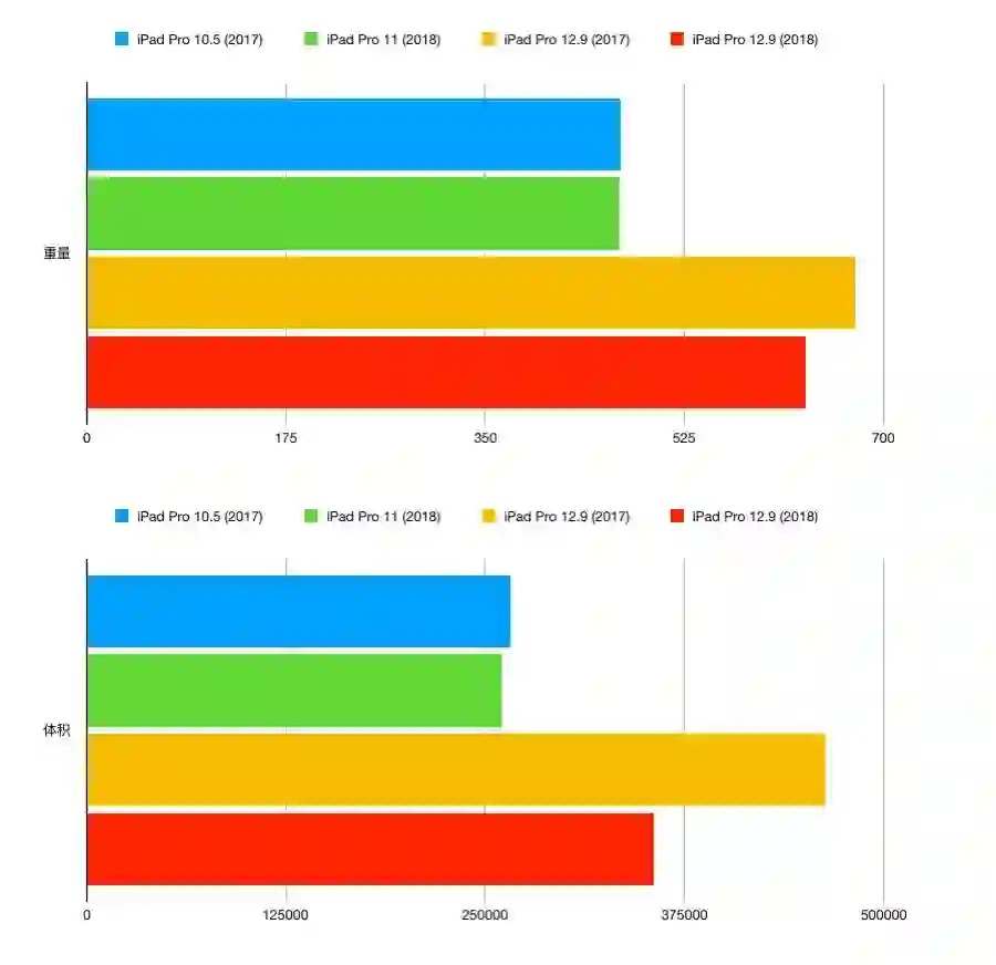 根据苹果官网给出的数据以及 Mactracker 上的数据,我整理了一下 2017 款 iPad Pro 10.5''、iPad 12.9'' 以及 2018 款 iPad Pro 11''、iPad Pro 12.9'' 无线局域网机型的体积和重量,并在下图中做了一个比较。