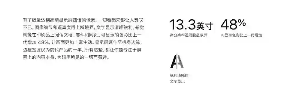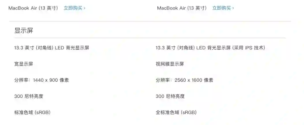 旧款 MacBook Air 的大颗粒屏幕终于成为了历史,新款 MacBook Air 也换上了 Retina 屏幕。可是,这块屏幕和 MacBook Pro 的屏幕有区别吗?苹果当然不会在发布会上说,唯一的线索是「可显示的色彩比上一代增加 48%」。