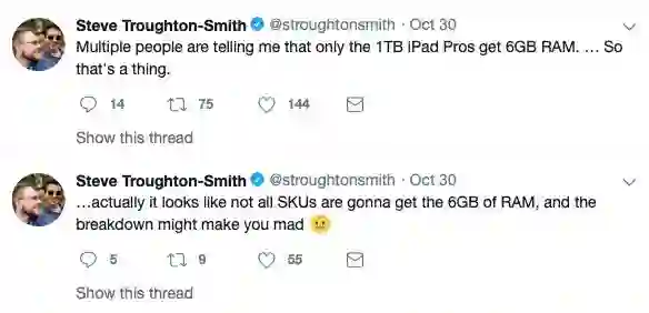 在发布会结束后,推特用户 @stroughtonsmith 就曝光说新款 iPad Pro 只有 1 TB 容量的型号升级到了 6 GB RAM,其余的型号保持了 4 GB RAM。