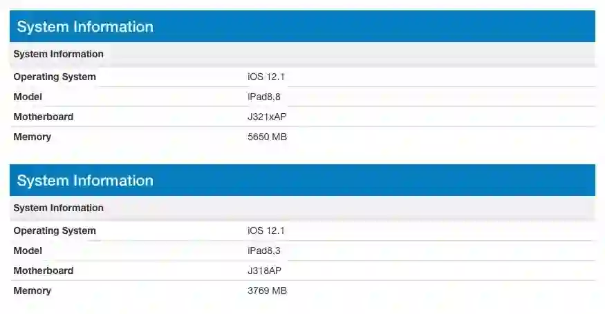 昨日,新款 iPad Pro 的跑分也在 Geekbench 上曝光了。从下图中可以看到,代号为 iPad8,8 的设备对应的内存为 5650 MB,而代号为 iPad8,3 的设备对应的内存为 3769 MB。