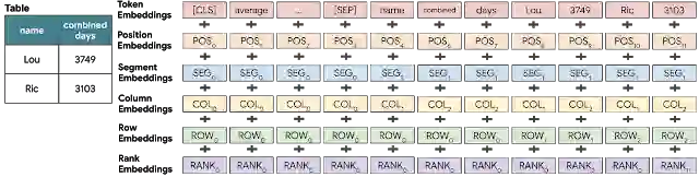 BERT 层输入:每个输入 token 都被表示成其词、绝对位置、句段(无论是属于问题还是表)、列和行以及数值排序的嵌入之和。 该模型有两个输出:1)一个分数,用于表示每个表格单元格的内容属于答案一部分的概率;2)一个聚合操作,用于表示是否应用操作以及应用哪些操作来将各个单元格的内容聚合成最终答案。下图展示了对于问题「两位顶级摔跤运动员的冠军赛平均时间是多少?」,该模型有较高的概率选择 Combined days 列的前两个单元格以及使用 AVERAGE 操作。