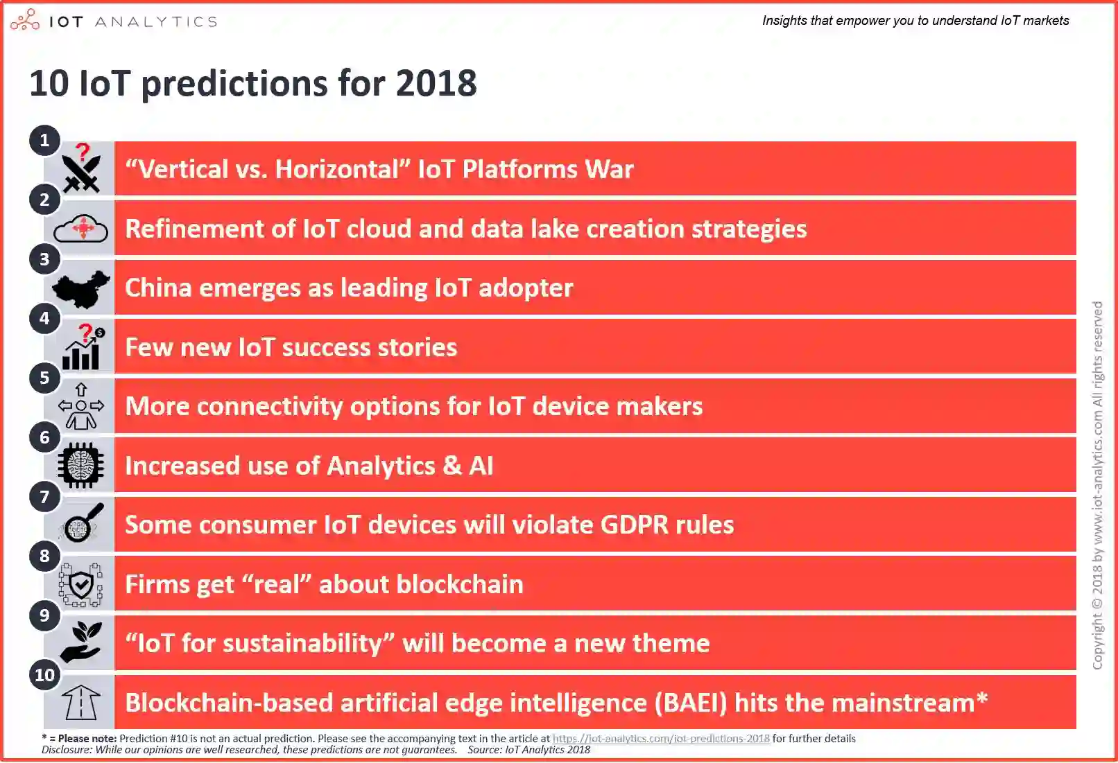 知名物联网行业研究机构IoT Analytics曾在文章中提出过4个关于2017年的物联网预测,如今看来,这些预测大都变成了现实。站在当下这个时间点上,在给出2018年十大物联网预测之前,我们有必要针对去年这4个预测先做下回顾,同时针对这些预测发表我们最新的想法: