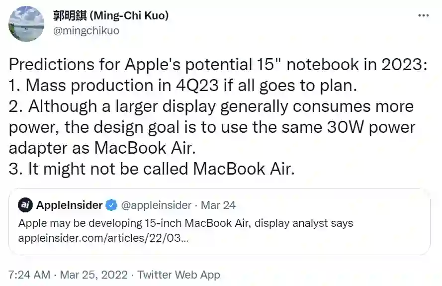 郭明錤今日在推特发文表示,传闻中苹果正在开发的 15 英寸 MacBook 可能不会被称为“ MacBook Air ”。针对 15 英寸的 MacBook ,他指出虽然更大的屏幕通常会更耗电,但这款笔记本设计目标是使用与 MacBook Air 相同的 30W 电源适配器。此外,显示器分析师 Ross Young 昨天指出,这款 15 英寸设备将在 2023 年问世。郭明錤进一步缩小了时间范围,称“如果一切按计划进行,这款笔记本将于 2023 年第四季度量产”。