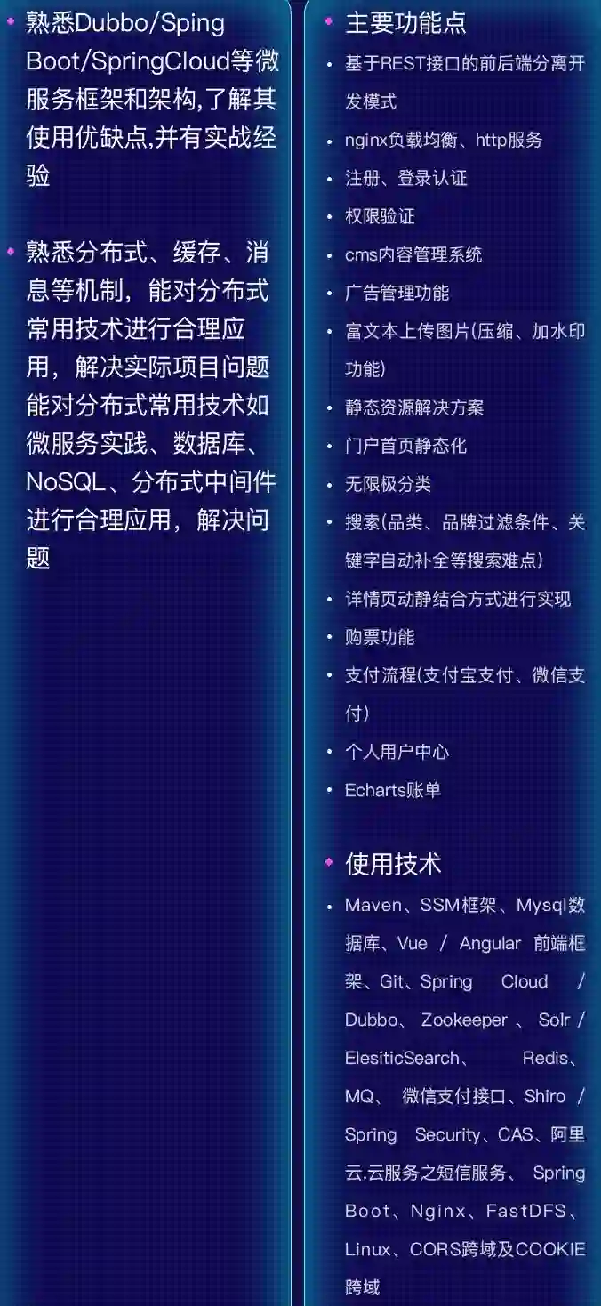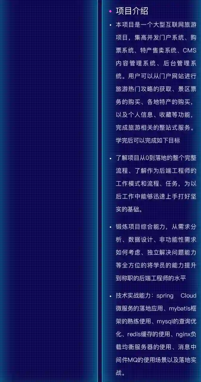 到了分布式架构和项目阶段我们会完成从单体架构到微服务架构的演进,将运营商后台、商家管理后台与门户系统使用微服务进行项目落地,实现整个大型互联网项目从0到上线的整个流程,包括项目服务器环境搭建到项目部署上线与调试。