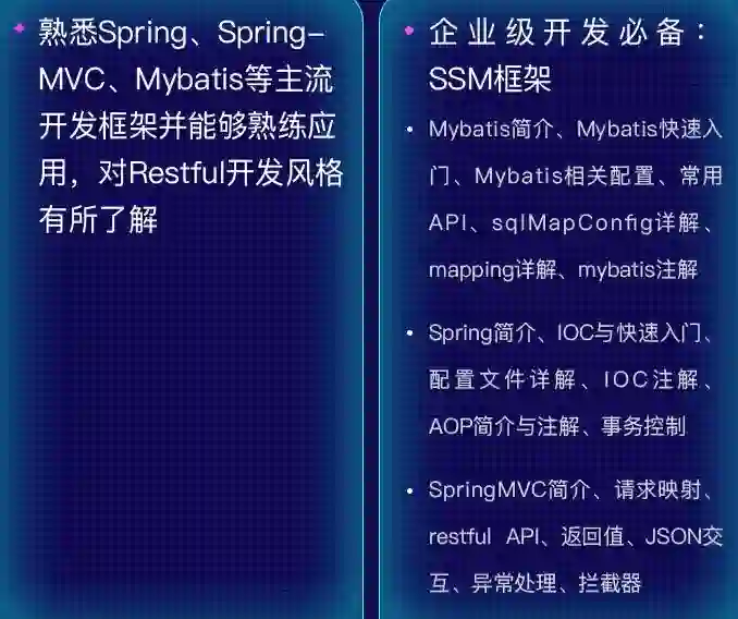到了 SSM 阶段,我们会在讲述完框架的内容后,带学员们完成 Maven 版的 SSM 框架的搭建,并带领大家完成 JavaWeb 阶段的运营商后台系统的技术升级以及商家管理后台。
