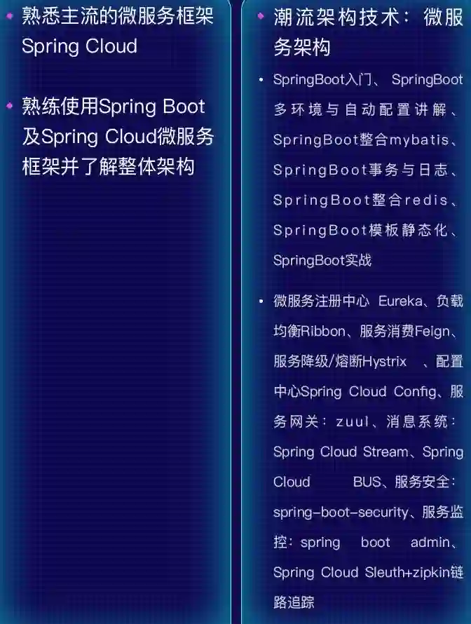 熟练掌握主流开发框架 SSM、分布式框架 zookeeper + dubbo,微服务架构 SpringBoot + SpringCloud,熟练掌握主流分布式技术的使用与实战,如 redis 缓存、MQ 消息中间件