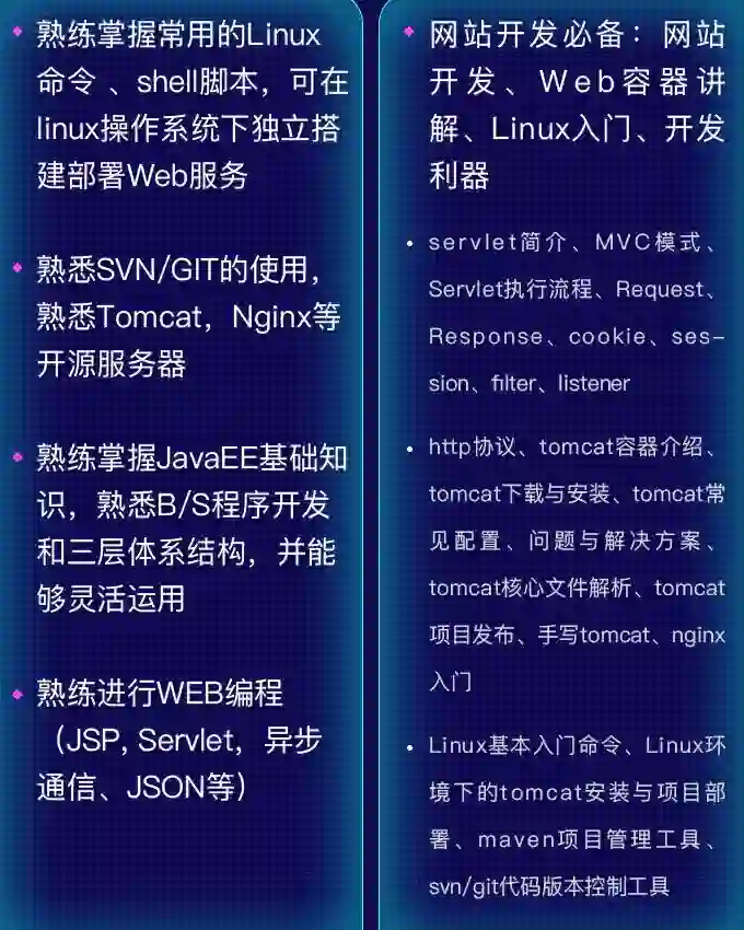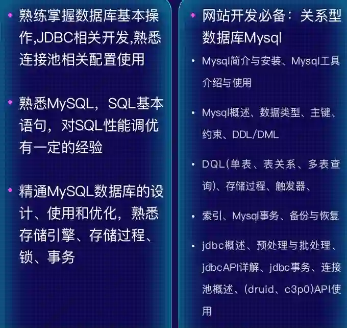 紧接着第二部分开始讲解 mysql 数据库和 JavaWeb 网站开发相关内容,让学员能够顺利接轨到网站开发方面,学习网站开发必备的数据库、http、请求、响应、动静分离等专业技能;