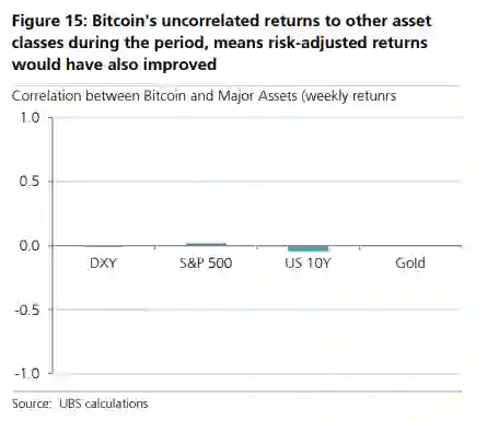 瑞银又比较了比特币与其它资产类别的平均关联度。研究发现,如果把数字货币视为一个资产类别,与股票、债券等传统资产类别的关联性是非常低的,几乎可以忽略不计。瑞银指出,也正因此,因此,比特币能够被用于多元化投资。