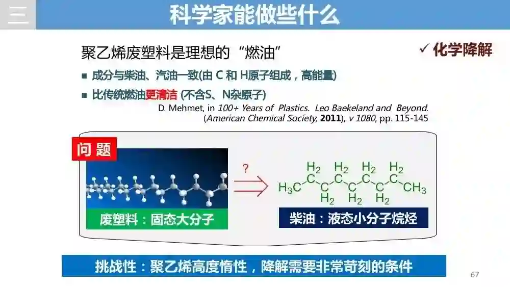 讲座上他还详细讲解了他最感兴趣的研究方向之一:烷烃资源的高效利用。“绿色化学是我们研究遵循的核心理念。虽然之前也有办法将聚乙烯废塑料降解,但涉及到高温、产物选择性差等各种问题,我们通过催化剂的介入可以在温和的条件下选择性生成清洁的柴油。”