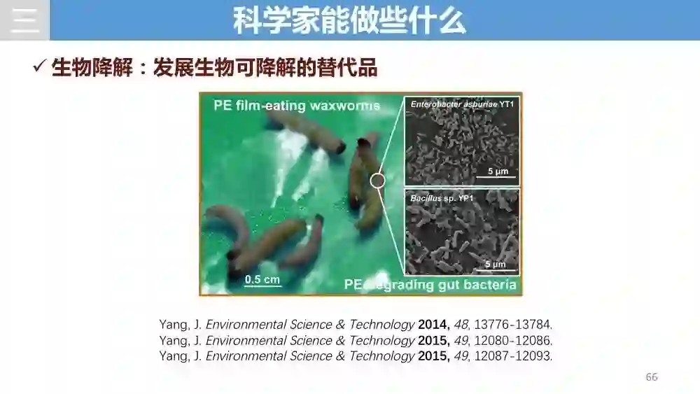 不只是化学家,生物学家也在为改善环境努力。王皓毅给出了生物降解塑料垃圾的例子。比如:中国科学家用面包虫,日本科学家用细菌来降解塑料。就像前面提到的塑料垃圾增加,主要原因是处理不当。