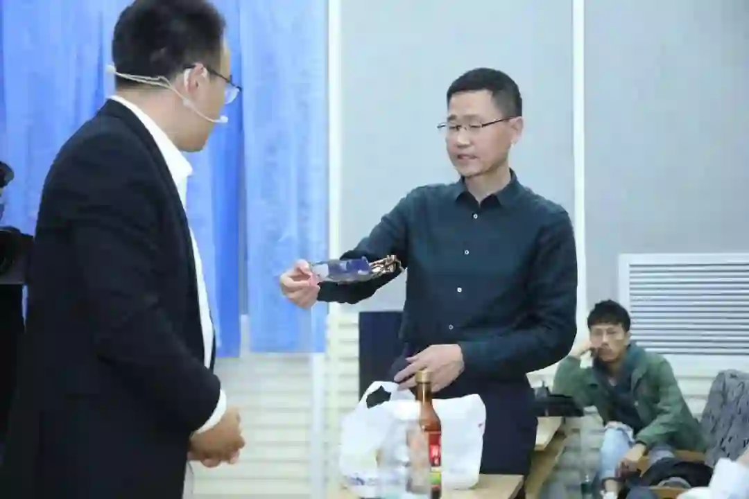 讲座前嘉宾手持未来论坛为嘉宾手绘的专属小肖像并合影