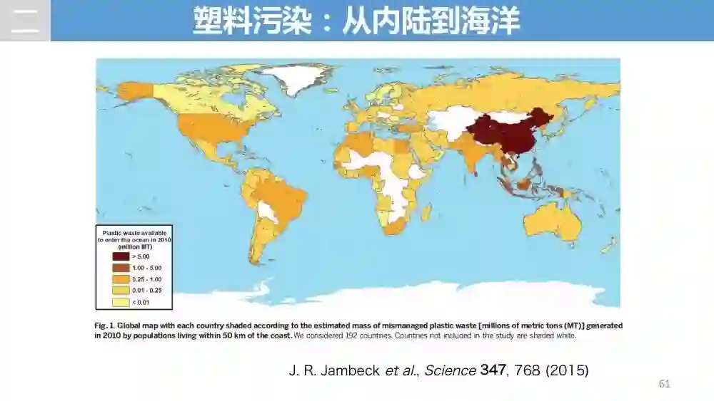 美国佐治亚大学研究组在2015年2月13日发行的美国《科学》杂志上发表的统计结果显示,全球每年流入海洋的塑料垃圾达480万至1270万吨。中国以每年132万至353万吨居于首位,印度尼西亚以48万至129万吨排在第二,菲律宾以28万至75万吨排在第三。塑料垃圾已经给人类的生存环境乃至整个地球带来了危害。