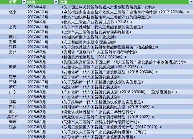 除此之外,国内各地方政府对人工智能的重视度也呈升温趋势,并相继出台 AI 发展规划。从 2016 年开始,北京、江苏、贵州等地方政府最先出台了 AI 相关的发展规划的政策。据不完全统计,截止到今年 10 月,全国已有 20 个省市推出新一代人工智能发展规划。