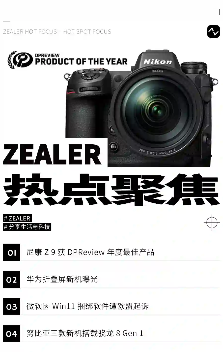 摄影器材评测机构 DPReview 近日公布了 2021 年度器材榜,这一榜单涵盖了相机、镜头、配件、无人机等多款产品,其中尼康 Z 9 无反相机获得了年度最佳产品的奖项。该机构表示,尼康 Z 9 产品搭载行业领先 3D 自动对焦系统,拥有 4517 万像素堆栈式全画幅传感器,搭载 Expeed 7 数码影像处理器。该产品除了拥有强大的拍照功能,视频拍摄的规格也十分高。