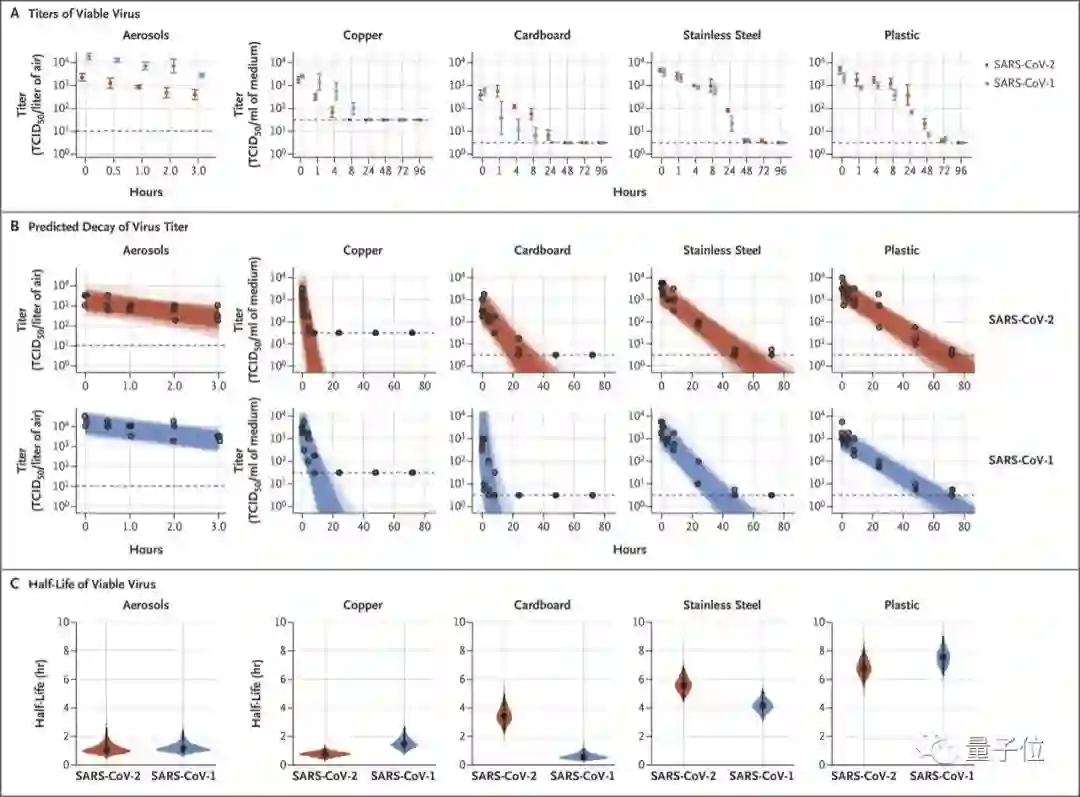 文章的作者测试了现在的新冠病毒(SARS-CoV-2)和过去的SARS病毒在5种条件(气溶胶和4种表面)的存活时间,并使用贝叶斯回归模型估算了这两种病毒的衰减率。