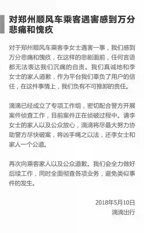 5月10日,滴滴针对媒体报道的21岁空姐李女士搭乘滴滴顺风车遇害一事,发布公告向受害者家属及公众道歉,表示已经成立专项工作组,密切配合警方开展案件侦查工作。同时,滴滴承诺将全力做好后续工作,全面彻查各项业务,避免类似事件发生。