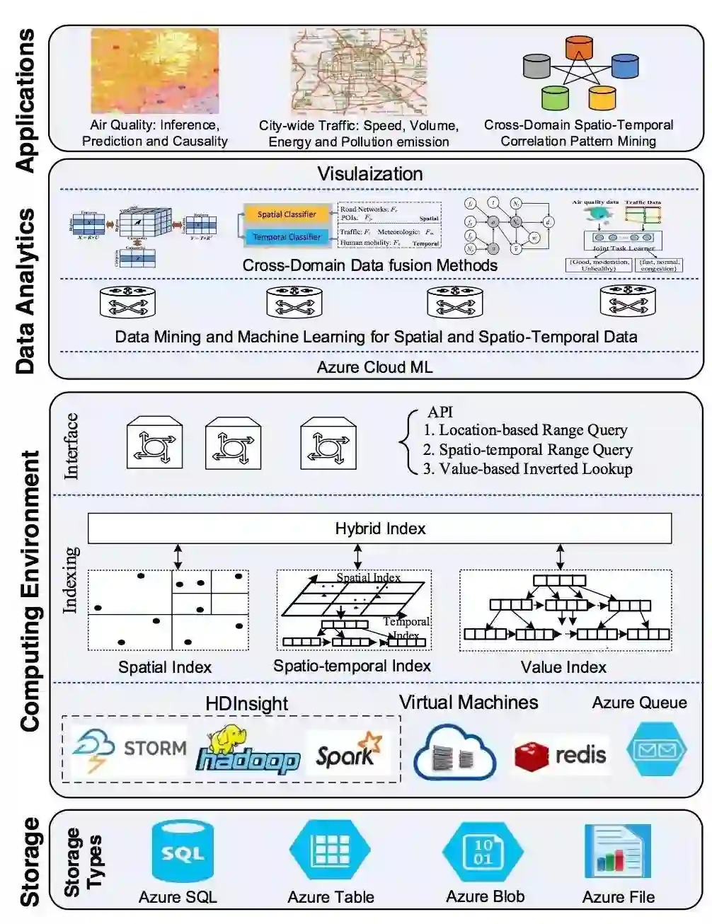 针对这些问题,郑宇领导的微软城市计算科研团队提出了一种新型城市大数据平台。这一平台具备6中数据结构,4中存储方式,支持包括hadoop和spark在内的多种运算环境。