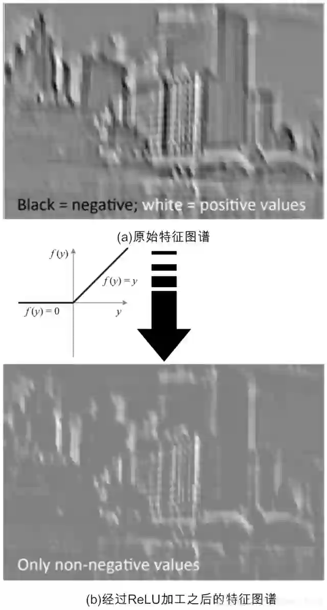 前面的描述可能还过于抽象,下面我们再用一个更为生动的案例来理解ReLU的操作,图12-6演示了ReLU“修正”前后的特征图谱。