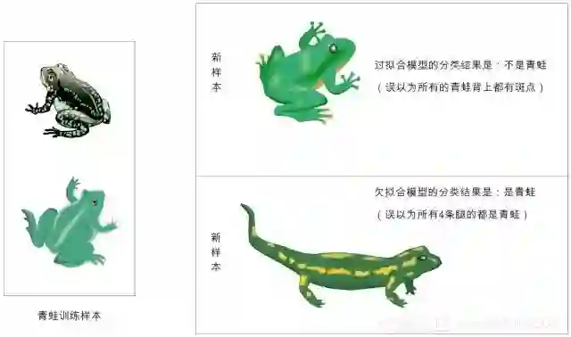 “欠拟合”比较容易理解,就是样本不够,或学习算法不精,连已有数据中的特征都没有学习好,自然当面对新样本做预测时,效果肯定也好不到哪里去。比如说,在图12-2中(右下图),若果仅仅把样本中的“四条腿”当作青蛙的特征,这“欠缺”的特征,就会把一只四条腿的壁虎也当作青蛙。其实,欠拟合比较容易克服,比如在决策树算法中扩展分枝,再比如在神经网络中增加训练的轮数,从而可以更加“细腻”地学习样本种的特征。