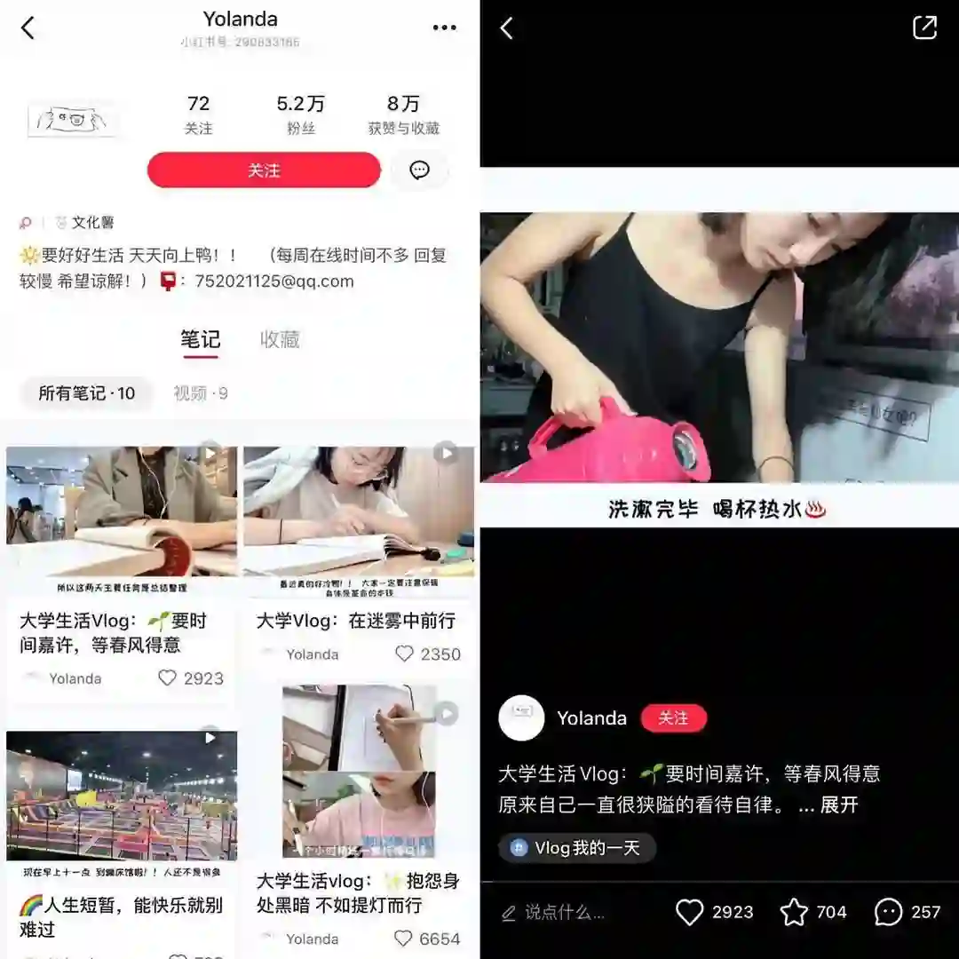 「Yolanda」的vlog中记录了自己几天的大学生活和感悟,比如与他人如何交往、心态上如何调整等,获得2923次点赞。