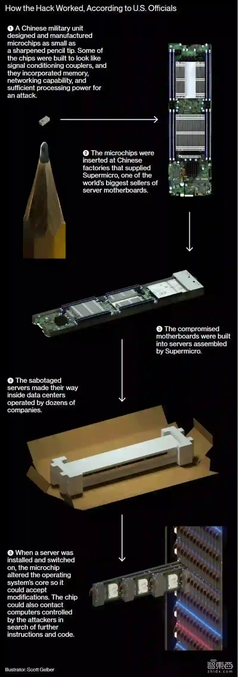 这篇文章题目为《The Big Hack: How China Used a Tiny Chip to Infiltrate U.S. Companies(大黑客:中国如何用迷你芯片入侵美国公司)》,据文章显示,近30家美国IT公司,被如图所示的一枚不到铅笔尖大小的中国芯片给攻击了。