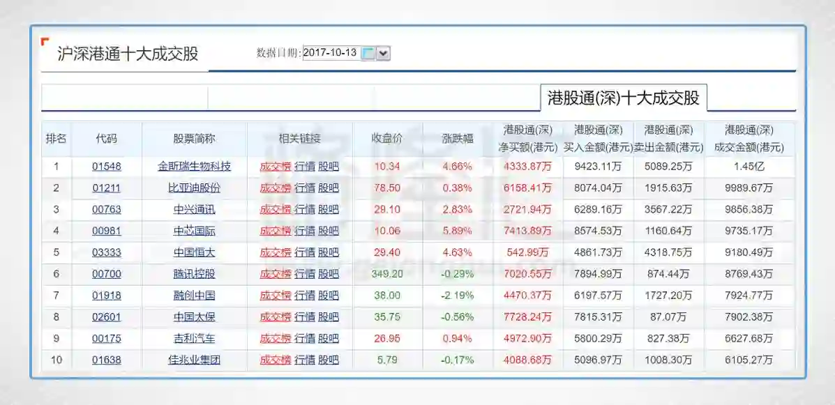 今日港股通(深)前十大成交个股是金斯瑞生物科技、比亚迪股份、中兴通讯、中芯国际、中国恒大、腾讯控股、融创中国、中国太保、吉利汽车、佳兆业集团。其中净流入最多的个股是中国太保,净流入7728.24万,前十大成交中无净流出个股。