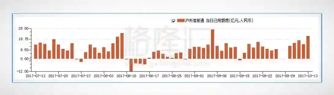 港股通资金全天净流入32.48亿元,这是自9月7日以来首次站上30亿元上方(其中港股通(沪)净流入21.69亿元,港股通(深)净流入10.79亿元),港股通今日共成交110.88亿元,占总成交额的比重为6.4%。整体来看,从10月9日至今(本周),港股通资金净流入额在呈明显的逐步增加态势,净流入总额达131.16亿元。