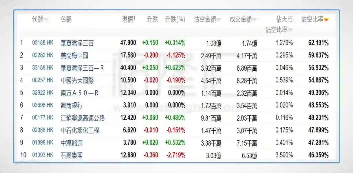今日前10位沽空比率最高的个股分别是美高梅中国(02282.HK)、光大国际(00257.HK)、徽商银行(03698.HK)、江苏宁沪高速公路(00177.HK)、中石化炼化工程(02386.HK)、中煤能源(01898.HK)、石药集团(01093.HK)、东瑞制药(02348.HK)、电视广播(00511.HK)、普拉达(01913.HK)。
