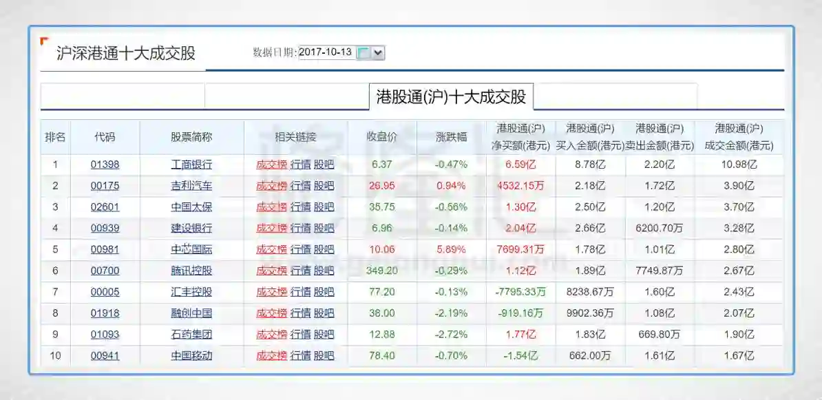 今日港股通(沪)前十大成交个股是工商银行、吉利汽车、中国太保、建设银行、中芯国际、腾讯控股、汇丰控股、融创中国、石药集团、中国移动。其中净流入最多的个股是工商银行,净流入6.59亿;净流出最多的个股是中国移动,净流出1.54亿。