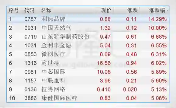 今日港股通标的中涨幅前五的个股是利标品牌(00787.HK)、中国天然气(00931.HK)、山东新华制药股份(00719.HK)、金利丰金融(01031.HK)、微创医疗(00853.HK)。