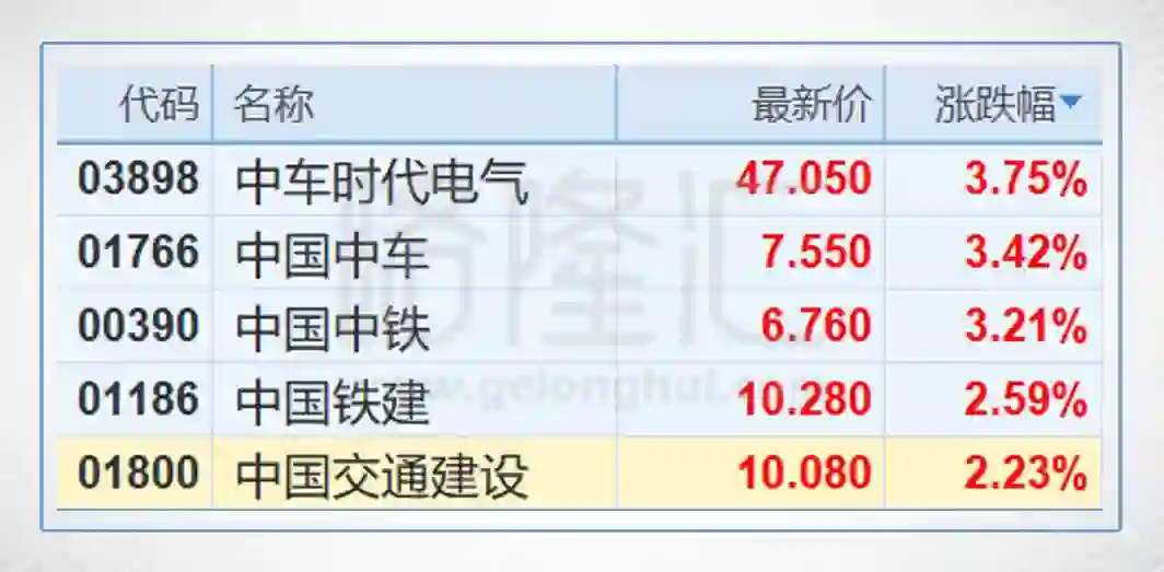 此外,高铁基建股全线爆发,中国中车(01766.HK)涨3.42%;中国中铁(00390.HK)涨3.21%;中国铁建(01186.HK)涨2.59%,中国交通建设(01800.HK)涨2.23%。