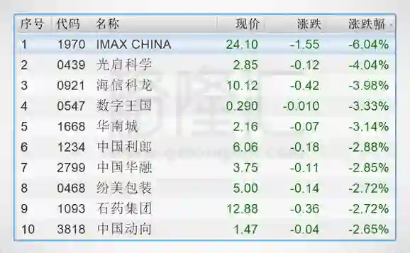 今日港股通标的中跌幅前五的个股是IMAX CHINA(01970.HK)、光启科学(00439.HK)、海信科龙(00921.HK)、数字王国(00547.HK)、华南城(01668.HK)。