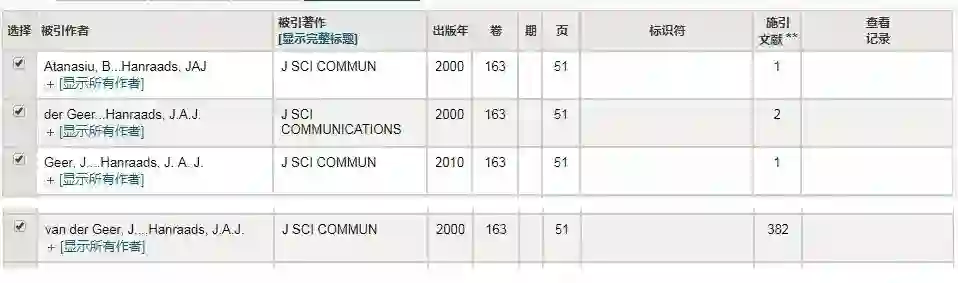 哈金使用这篇文献的作者名字“Hanraads”在 Web of Science 中搜索,结果显示,这篇据称发表于 2000 年的文章,被 398 篇论文引用过。