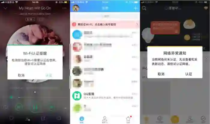 前段时间在上海坐地铁时连接了花生地铁WIFI,打开QQ音乐开始听歌,QQ音乐居然给了我一个"WIFI认证提醒"的弹窗,点击认证就跳转到了花生地铁WIFI的认证页,之后顺利联网成功,体验非常爽。作为一名iOS开发,不禁思考这个是怎么做到的呢?忘记WIFI重新连接后,打开手机里各个应用轮番测试一遍,发现QQ音乐、QQ、QQ空间三个应用都做了比较好的WIFI认证提示: