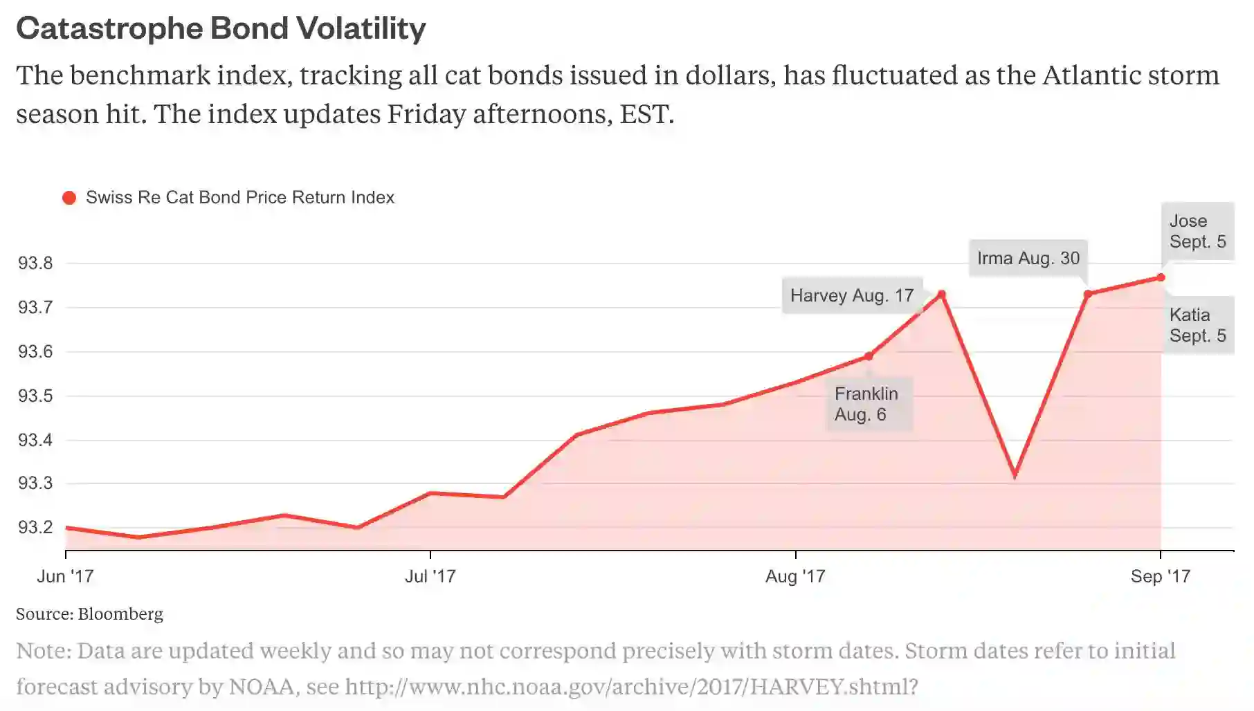 追踪所有以美元发行的巨灾债券可发现,基准指数在大西洋风暴季到来之际发生波动