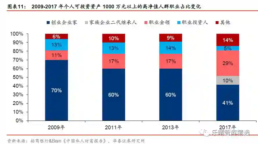 私人银行客群结构开始由以创业企业家为主转向多样化。私人银行客户的主要职业有创业企业家、家族企业二代继承人、职业金领、职业投资人等,2017 年85%的高净值人群职业为上述四种。创业企业家仍为高净值人群最主要的职业类型,占比为41%。但随着近年来民营企业的代际传承需求上升,二代继承人的比例上升显著。同时,随着企业管理专业性的提高及资本市场的发展,职业金领及投资人占高净值人群的比例也出现提升。私人银行客群结构的变化意味着客户需求也将改变。首先,创业企业家的老去意味着家族传承的需求上升;其次,专业知识更丰富的职业金领的增加意味着财富管理专业化的需求提升。