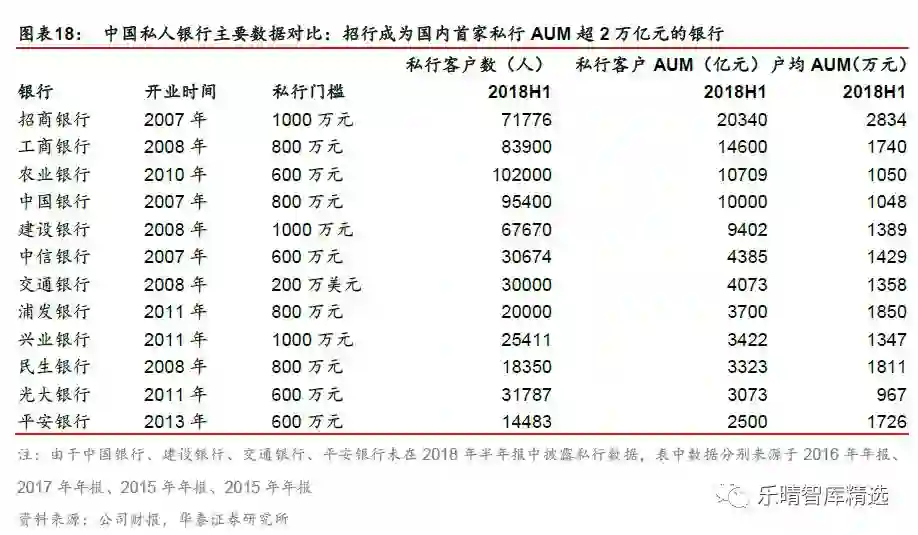 中国的私人银行起步于2005 年,2007 年中行、招行私人银行的开业标志着私行行业步入中资时代。2005 年,瑞士友邦银行在中国成立首家私人银行,随后花旗、汇丰、法巴银行等外资私人银行纷纷进驻中国内地。2007 年3 月中国银行与RBS 合作在境内推出私人银行业务,8 月招商银行私人银行部正式成立,随后工行、中信、建行、交行、民生等多家中资私人银行开业,中国私人银行的竞争格局初现。中资私人银行客户门槛不一,其中交通银行的200 万美元为行业最高,其他大中型银行客户门槛大多在600 万元-1000 万元。从2018 年半年报披露私行数据的大中型银行来看,农业银行客户数量最多,达10.2 万人,而招商银行则成为了国内首家私行AUM 超过2 万亿元的银行。
