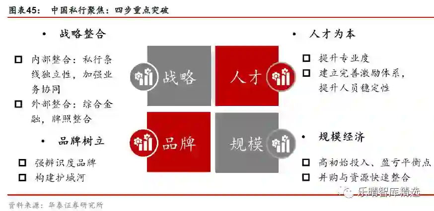 我们借鉴国外成熟私人银行发展经验,分析中国私人银行业可在战略整合、人才培养、品牌建立、规模扩张上重点发力。其中,战略整合有内外整合两层,对内主要是将私人银行作为顶层战略,既强化私行与其他条线的联动作用,又须保障私行战略地位,以保证其品牌与业务的独立性,对外主要指利用集团的综合金融牌照优势,加强多个子公司之间的互补整合,发挥协同作用,强化私行业务的全品类金融服务能力。人才培养,主要在于提升私行投资顾问与客户经理的专业性,并完善激励体系,提升人员团队稳定性。品牌建立,国内私行仍需寻找其差异化定位,结合自身禀赋,打造具有强辨识度品牌,增强品牌溢出作用。最后,在规模扩张上,目前仍是国内私行发展的初期阶段,通过并购、资源整合等方式快速实现规模扩张,是打造品牌与实现规模经济的快速通道。