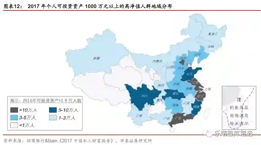 私人银行客群主要分布于粤、沪、京、江、浙五个省市,但近年来区域集中度逐渐降低。2016 年,粤、沪、京、江、浙五个东部沿海省市的高净值人士人数占全国总数比例约为47%,其持有的可投资资产占全国高净值人群财富的比重约为62%。近年来,随着中西部省市的经济发展,当地私人银行客户数量也增长较快,2008-2016 年,除上述五省市外的其他省市高净值人群占比由不足50%上升至53%。而由于2016 年一二线城市房地产价格的快速上升,2016 年上述五省市高净值人群财富比例跃升至62%。