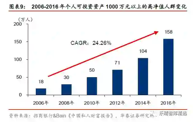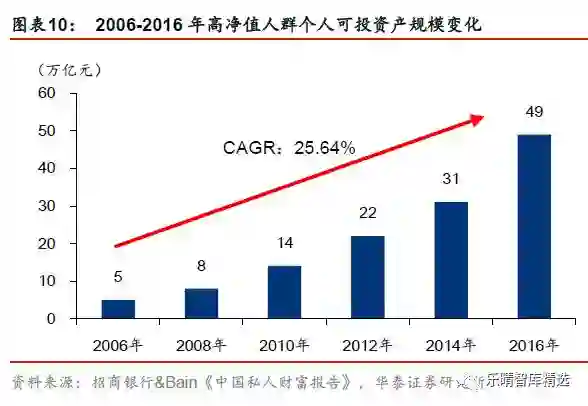 私人银行的目标客户数量及其资产规模保持较快增速。根据银监会2011 年发布的《商业银行理财产品销售管理办法》,私人银行客户被定义为“金融净资产达到600 万元人民币及以上的商业银行客户”。而实际上国内商业银行设置的私人银行客户门槛从600 万元至1000 万元不等,此处我们将主要研究个人可投资资产超过1000 万元的高净值人群。根据招商银行&Bain《2017 年私人财富报告》的数据,2016 年末中国的高净值人群数量达到158 万人,2006-2016 年年均复合增长率达24%,其中个人可投资资产超过1 亿元的超高净值人群同期CAGR 达33%。2006-2016 年高净值人群资产可投资资产规模CAGR 达25%,超高净值人群则为35%。私人银行目标客群人群及其可投资产规模的快速壮大为中国私人银行发展提供了良好条件。