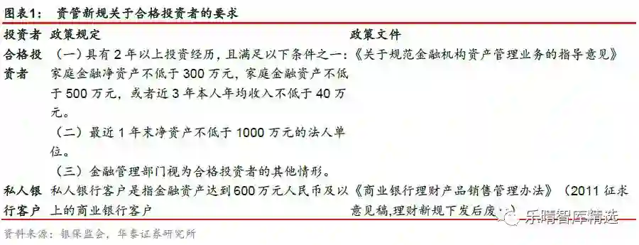 私人银行是资管转型下私募产品合格投资者的主要供应市场,构成银行理财差异化竞争的重要支撑。自2017 年资管新规征集意见稿下发以来,银行业展开理财转型序幕,主要围绕资管新规禁止资金池运作、满足期限匹配、适格投资者匹配、托管与估值规范运作等限制条件进行规范。2018 年4 月资管新规与9 月理财细则正式文件下发,构成银行理财业务的顶层监管体系,未来银行理财市场从资金端将划分为公募与私募市场,其投向和运作模式存在一定差异。