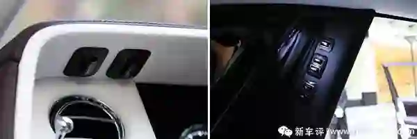 老款车型有个问题,因为车门较重并且有电动机构,所以手动开关的时候感觉很费力。让客户费力这个事情对劳斯莱斯来说是不太合适的,所以新幻影前后车门里面、外面都增加了电动关闭功能。车门把手上增加了两个小疙瘩就是车外关闭的按钮,车内关闭的按钮前排藏在了出风口的上方,后排还在老位置 C 柱那儿。当然,为了安全,车门依然是不能电动开启的。