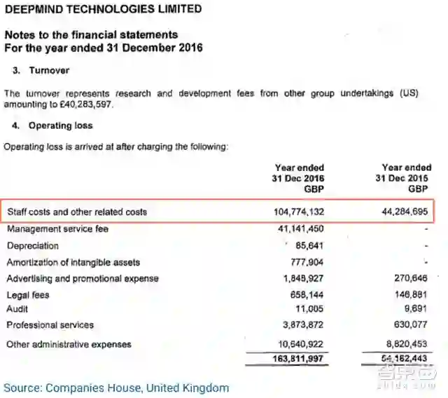 ▲DeepMind2016年财报表:员工成本和其他费用为1.048 亿英镑,领英显示其员工人数仅为 415 人
