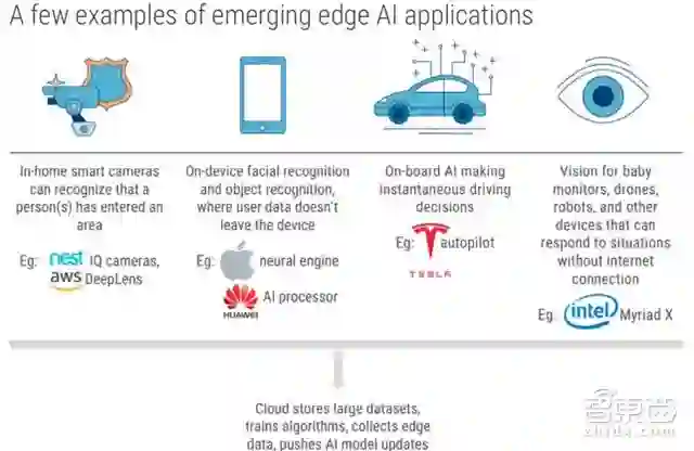 端侧AI可以实现更迅速、本地化、场景化的信息处理,比如自动驾驶无信号延迟风险的更实时的处理,本地设备的私人语音、面部特征数据训练等。这些实现依赖于新热点AI芯片,如苹果的A11(搭载神经引擎)、英特尔的Myriad X(视觉计算)、华为的麒麟970等。