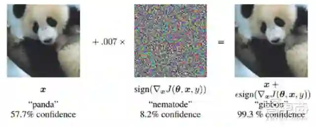▲CNN在人工噪音下将熊猫图片(置信度57.7%)错认为长臂猿(置信度99.3%)