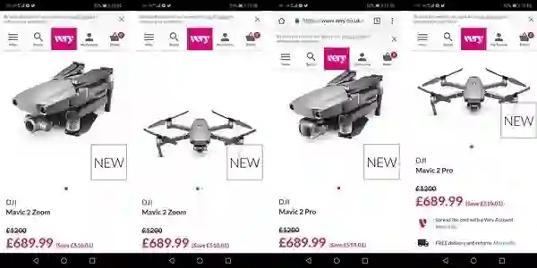 北京时间明晚22点大疆将举办年度最重要的一场发布会,届时Mavic 2无人机将登场。而就在今天,英国零售商Very意外将Mavic 2 Zoom/Pro上架,尽管随后删除,却仍被网友速度截图分享。不过,这次上架仅仅公开了外形和价格信息,配置并没有泄露。